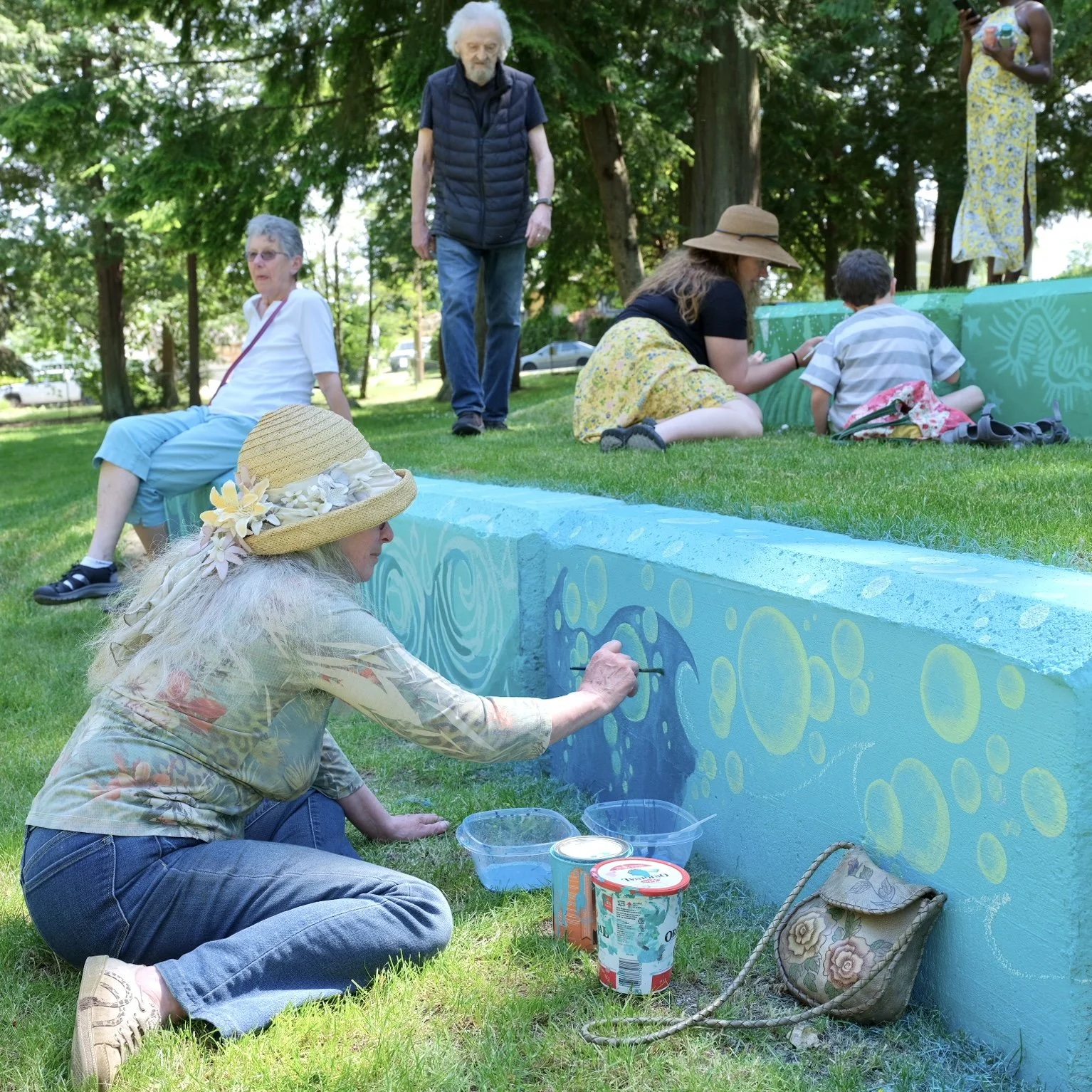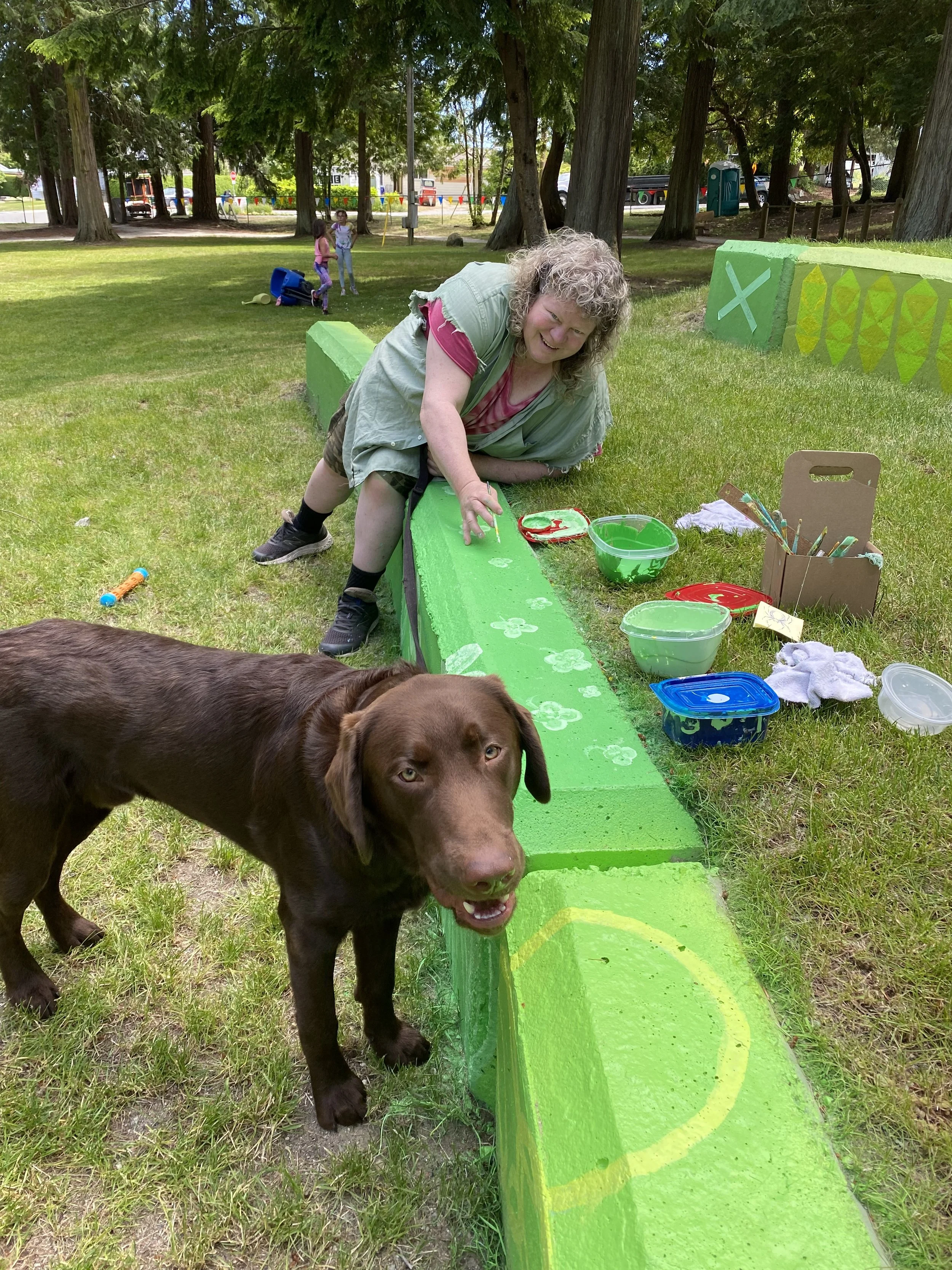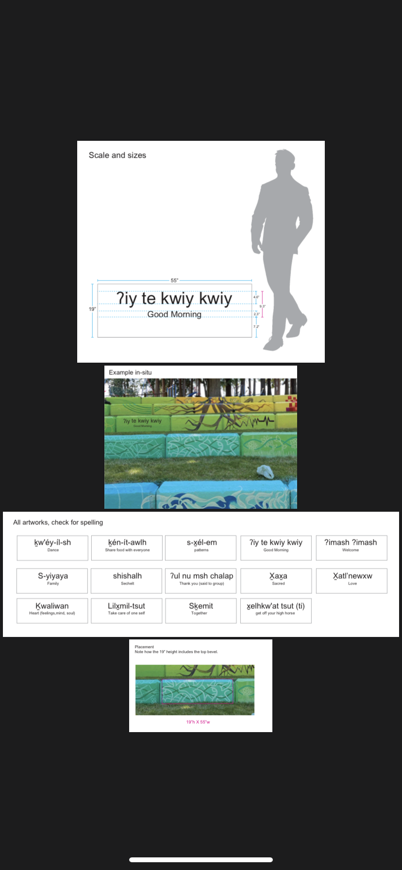 The object of this installation was to transform the grey cement seating blocks of the new Hackett Park Amphitheatre into an attractive, inviting, inspirational space. I started by applying a white primer coat, just like an artist’s canvas. After that came the base coats which are a gradient. Each block is unique with greens and earthy tones on the edge blocks, shifting and becoming brighter towards the middle. Community volunteers, from the very young (with some supervision) to seniors and experienced artists, then came out to paint patterns of their choice in lighter colours, thereby created a monochromatic effect within each block. (Some stencils were available for inspiration, paper for planning and chalk for participants to plan their design before going at it with paint.) This was a fun and exciting activity. We are all so pleased with the results which combine individual expression with an overall cohesive appearance. Next, to connect the blocks they were overlaid by a larger and darker pattern with a theme of frequencies. This started with waves on the lowest row and DNA on the second row. Higher up a braided pattern and block shaped tapestry were introduced to interrupt the horizontal block pattern, and then algorithms were added. Basically our reality is made up of waves, sound waves, light waves, frequencies, patterns and algorithms. We are also all connected symbolized by the tree roots, mycelium network linking directly to the heartbeat and then onto the next tree. The final step was to add an element of she shashishalhem in the form of words and phrases related to greetings and gatherings. We had a workshop with Rita Poulsen on June 27th to learn how to properly pronounce some phrases in she shashishalhem and to collaborate on which words we wanted to include in the mural. I am grateful to the Sechelt Nation for their cooperation and guidance with this. The she shashishalhem phrases are sprinkled throughout on the blocks, to be viewed when seated and from a closer distance. (The stencils created are reusable so that the language can be put elsewhere in the community. After the mural they would be donated.) On the smaller end blocks there is a QR code that links to my website with explanation and a time lapse video. There is also a link to shishalh.com where anyone can go to learn how to pronounce the greeting phrases and other she shashishalhem words including the (new?) road signs. I feel that is the missing link, language needs to not only be seen, but also heard; and then it can be learned! The overall design reveals a heart when you are looking from the perspective of the stage. Here the viewer will see how everything connects, the trees are growing into the mural, and there is a heart shape that emerges with a heartbeat pattern (another frequency.) From other vantage points you will not see the whole image.