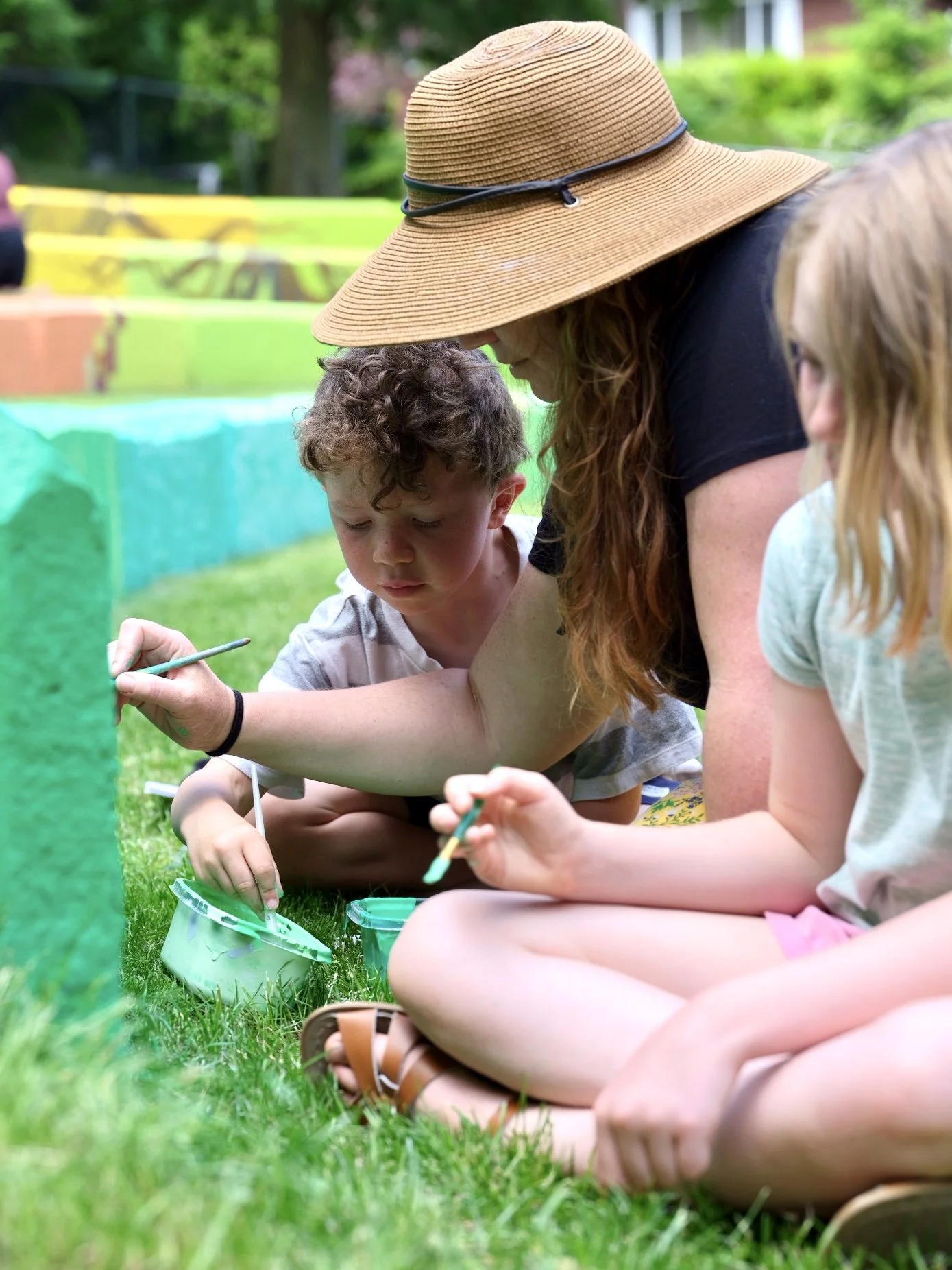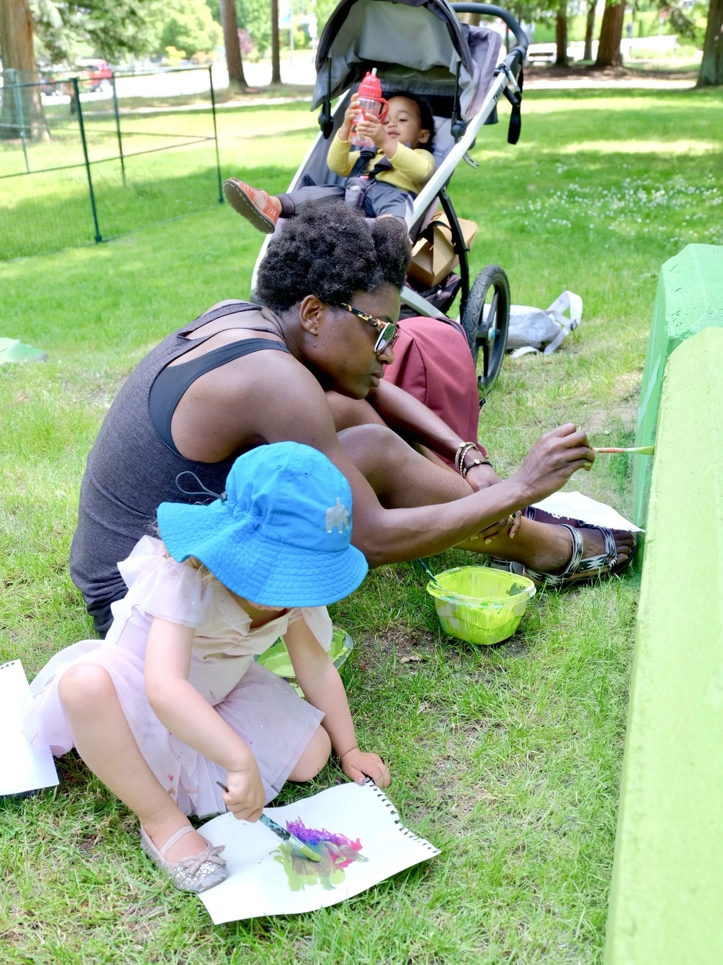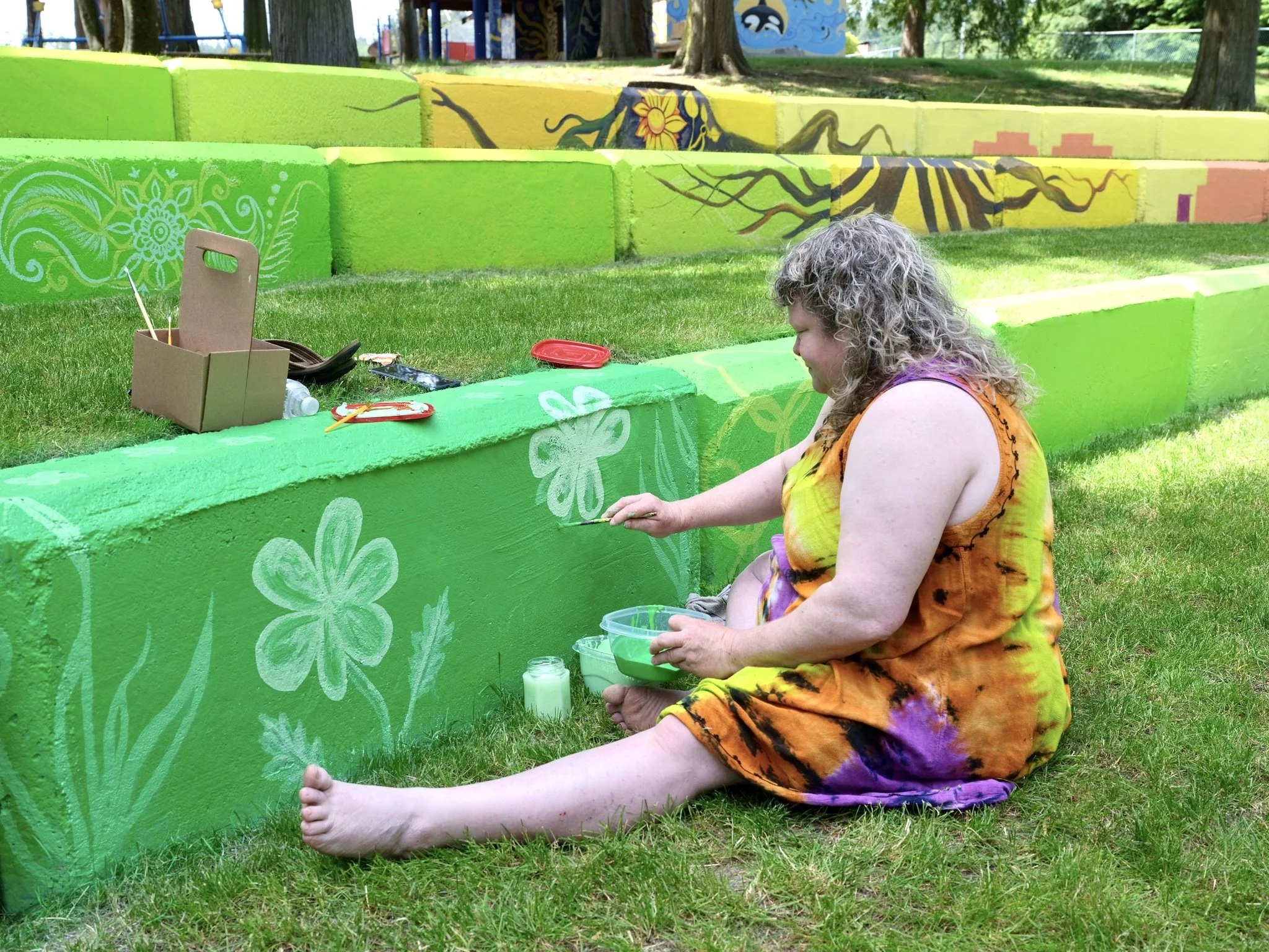 The object of this installation was to transform the grey cement seating blocks of the new Hackett Park Amphitheatre into an attractive, inviting, inspirational space. I started by applying a white primer coat, just like an artist’s canvas. After that came the base coats which are a gradient. Each block is unique with greens and earthy tones on the edge blocks, shifting and becoming brighter towards the middle. Community volunteers, from the very young (with some supervision) to seniors and experienced artists, then came out to paint patterns of their choice in lighter colours, thereby created a monochromatic effect within each block. (Some stencils were available for inspiration, paper for planning and chalk for participants to plan their design before going at it with paint.) This was a fun and exciting activity. We are all so pleased with the results which combine individual expression with an overall cohesive appearance. Next, to connect the blocks they were overlaid by a larger and darker pattern with a theme of frequencies. This started with waves on the lowest row and DNA on the second row. Higher up a braided pattern and block shaped tapestry were introduced to interrupt the horizontal block pattern, and then algorithms were added. Basically our reality is made up of waves, sound waves, light waves, frequencies, patterns and algorithms. We are also all connected symbolized by the tree roots, mycelium network linking directly to the heartbeat and then onto the next tree. The final step was to add an element of she shashishalhem in the form of words and phrases related to greetings and gatherings. We had a workshop with Rita Poulsen on June 27th to learn how to properly pronounce some phrases in she shashishalhem and to collaborate on which words we wanted to include in the mural. I am grateful to the Sechelt Nation for their cooperation and guidance with this. The she shashishalhem phrases are sprinkled throughout on the blocks, to be viewed when seated and from a closer distance. (The stencils created are reusable so that the language can be put elsewhere in the community. After the mural they would be donated.) On the smaller end blocks there is a QR code that links to my website with explanation and a time lapse video. There is also a link to shishalh.com where anyone can go to learn how to pronounce the greeting phrases and other she shashishalhem words including the (new?) road signs. I feel that is the missing link, language needs to not only be seen, but also heard; and then it can be learned! The overall design reveals a heart when you are looking from the perspective of the stage. Here the viewer will see how everything connects, the trees are growing into the mural, and there is a heart shape that emerges with a heartbeat pattern (another frequency.) From other vantage points you will not see the whole image.